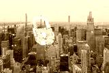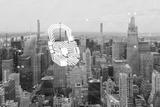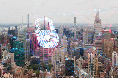 Cybersecurity concept with digital lock overlay on cityscape background of modern American metropolis skyline in daytime urban technology theme.