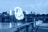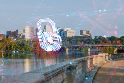 Digital cybersecurity concept overlay on USA cityscape with padlock symbol and circuit lines in urban background reflecting data protection theme.