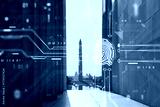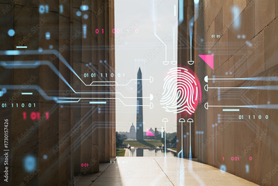 Cybersecurity fingerprint scan concept over Washington cityscape background, USA digital ID technology and data protection theme in futuristic style.