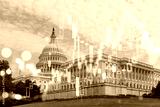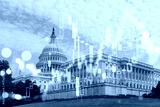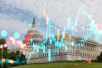 U.S. Capitol building with abstract financial chart overlays illustrating economic concept on a cityscape background in America under cloudy sky.
