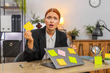 Young businesswoman at home office stares at sticky note covered laptop stressed by piling chores. Freelancer girl at table rips notes away fearing unfinished goals and racing clock before day ends