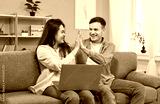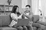 Happy married couple enjoying online, internet leisure activities together at home, using a laptop on sofa. Give each other high five, symbolizing joy and togetherness in the digital age.