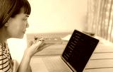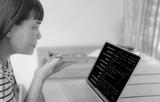 Asian woman using voice command on smartphone while working on laptop with code on screen. Concept of multitasking, voice technology, remote work, AI assistant, and programming