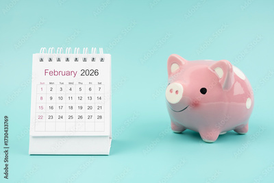 February 2026 Desk calendar and pink piggy bank on blue background.