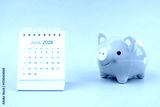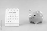June 2026 Desk calendar and pink piggy bank on blue background.
