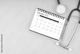 February 2026 desk calendar and stethoscope on blue color, Position with copy space.