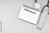 December 2026 desk calendar and stethoscope on blue color, Position with copy space.
