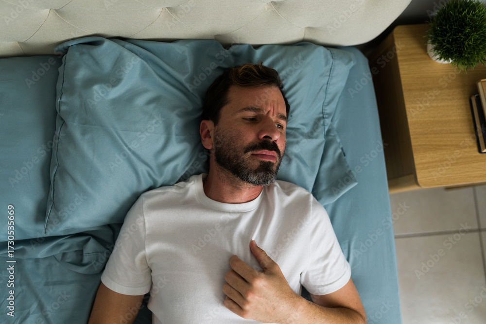 Depressed man lying in bed after breakup, experiencing heartbreak and anxiety