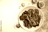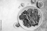 Raw organic steak with ingredients for cooking on a white background. Top view with copy space. High quality photo