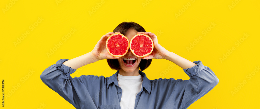 Vitamins for beauty and skin care concept. Young lady covering her eyes with grapefruit halves on yellow studio background. Casual woman holding fruits near her face