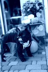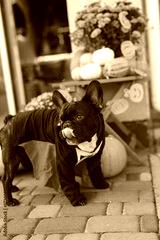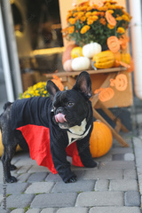 French bulldog in Halloween costumes stands in beautiful decor, pumpkin, postcards, flowers. Beautifully decorated street