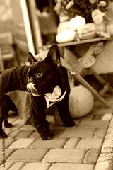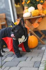 French bulldog in Halloween costumes stands in beautiful decor, pumpkin, postcards, flowers. Beautifully decorated street