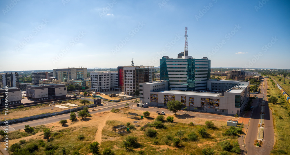 aerial view Gaborone CBD central, city skyline, bustling central business district, new buildings