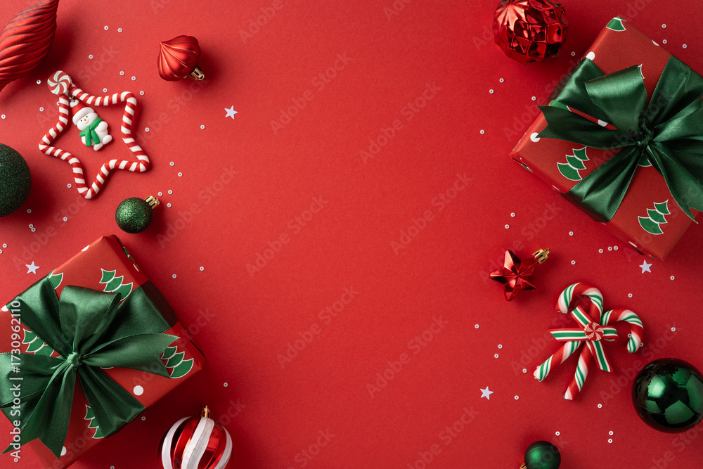 Vibrant festive scene with wrapped gifts, ornaments, candy canes, and stars on a red backdrop, evoking Christmas and New Year cheer and warm holiday mood