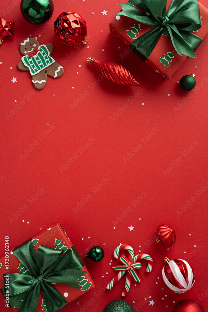 Vibrant vertical red holiday scene featuring wrapped gifts, green bows, gingerbread cookie, candy canes and festive ornaments, perfect for Christmas and New Year celebration materials