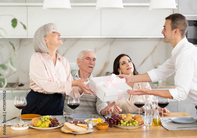 Young man handing a gift to senior woman sitting around table and drinking wine together at home
