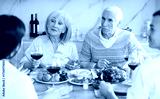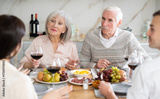 Mature couple are sitting at table, chatting sweetly, discussing and telling news, sharing plans with adult children. Senior woman and man celebrate housewarming party with middle-aged guests spouses