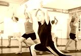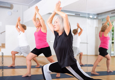 Portrait of concentrated modern aged woman practicing yoga postures during group training at gym, performing Anjaneyasana or Ashwa Sanchalanasana .