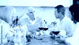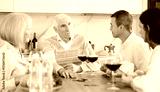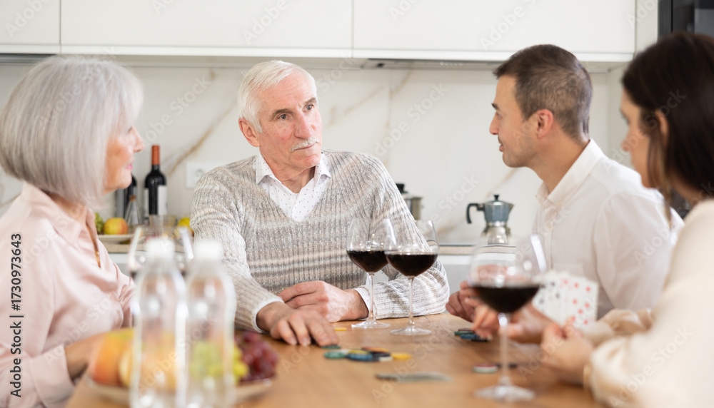 Joyful senior parents and young couple sitting around table playing with cards and drinking wine in goblets at home
