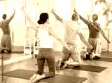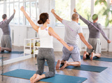 Group of elderly women and men doing stretching exercises with a resistance band. Good mood and healthy lifestyle concept