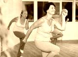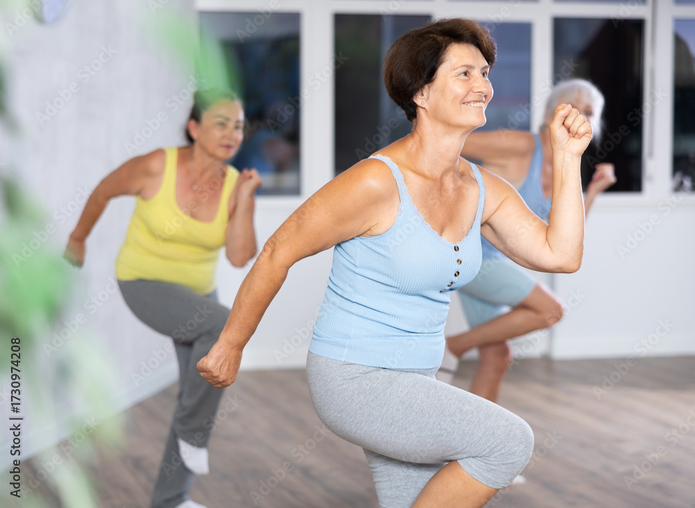 Group company of mature women learn to dance sports contemporary jazz modern in gym. Joint pastime, active lifestyle concept
