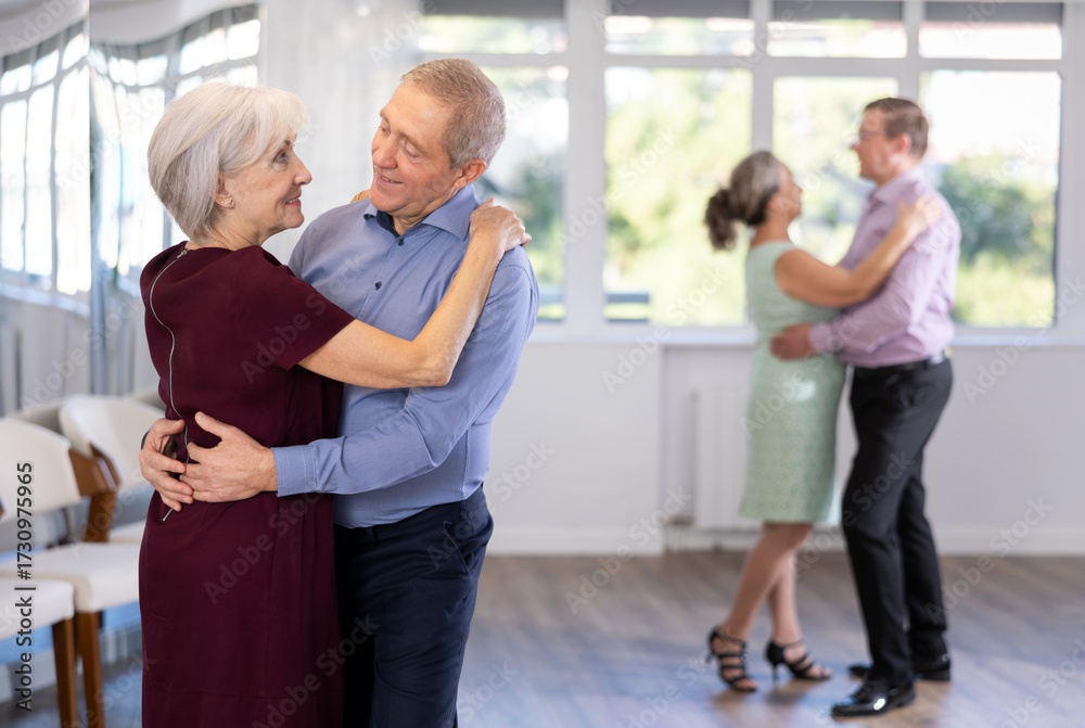 Smiling man supporting mature lady, dancing slow foxtrot in pair during group class in modern choreography studio