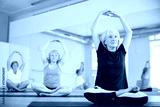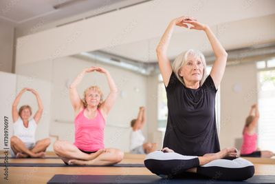 Elderly active women practicing yoga trainin the lotus position in the fitness studio during a group class