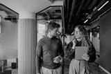 Two business colleagues walking and discussing work in a modern office corridor, focused on a tablet