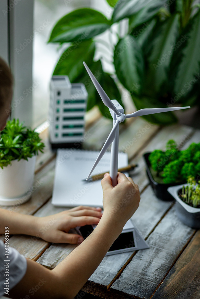 Ecology project, sustainable development education at school. Kid doing scientific research on renewable energy, biodiversity, recycling. Problems of global warming, climat change. Future city design