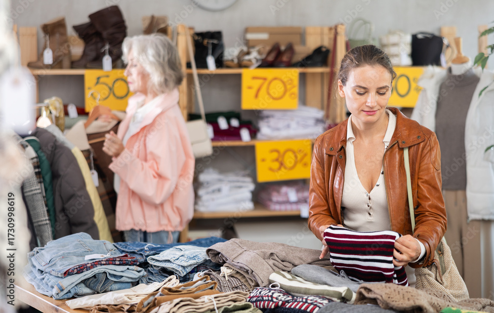 Young woman buyer choosing warm sweater in clothing store