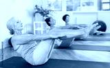 In fitness studio with small group of friends, elderly woman performs boat asana - Paripurna navasana. Senior slender woman participates in yoga classes.