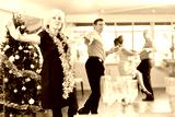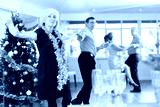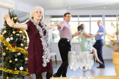 Adult man and elderly woman dance energetic twist dance in studio..