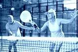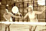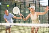 Active aged man and woman practicing Padel Tennis with other players in the tennis court outdoors