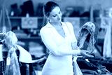 Young woman buyer choosing warm winter fur hat in clothing store