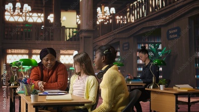 Satisfied teenagers students doing high five next to tutor in the library, feeling happy with their progress on school subjects. Professor being proud of her scholars at private lessons. Camera A.