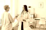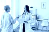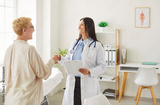 Hospital visit, happy positive medical professional doctor, young nurse meets, giving support and help to senior female patient at appointment, old woman visiting, consulting young physician in office