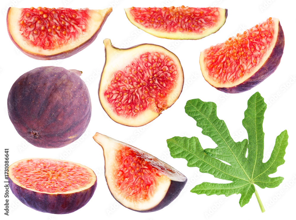 Fresh ripe figs and green leaf isolated on white, set. Whole and sliced