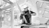 Construction. Worker in helmet and safety vest holding wooden planks and power drill at building site, carpentry, housing, architecture, building project.