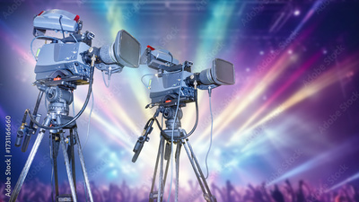 Filming equipment. Professional cameras on tripods. Filming equipment on concert stage. Two cameras for broadcasting from night club. Camera operators cameras near spotlights. Filming technologies