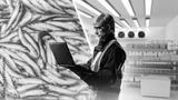 Man in freezer warehouse with fish. Supermarket warehouse employee. Supervisor with laptop near frozen fish. Refrigerated warehouse with seafood. Man with computer inside freezer. Chilled fish.