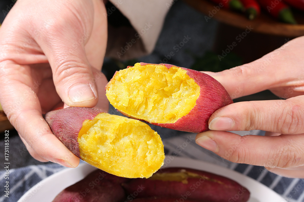 Fresh Cooked Sweet Potato Halves with Golden Yellow Flesh Held in Hands