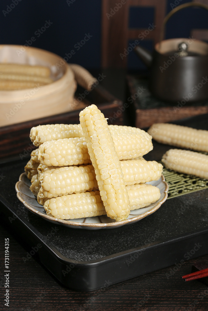 White Glutinous Corn Cobs on Plate with Traditional Steamer - Xishuangbanna Asian Food Photography