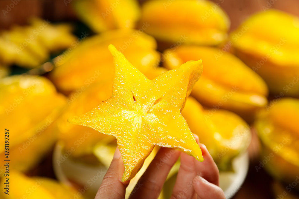 Fresh Star Fruit Carambola Slice in Hand Showing Natural Pentagram Shape Zhangzhou Sweet Tropical Fruit
