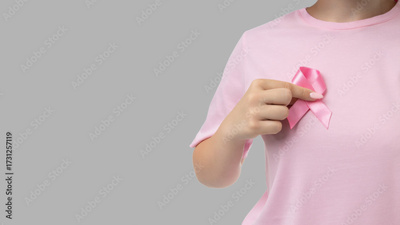 Woman wears a pink ribbon for cancer awareness