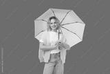Woman smiles while holding a white umbrella in bright light