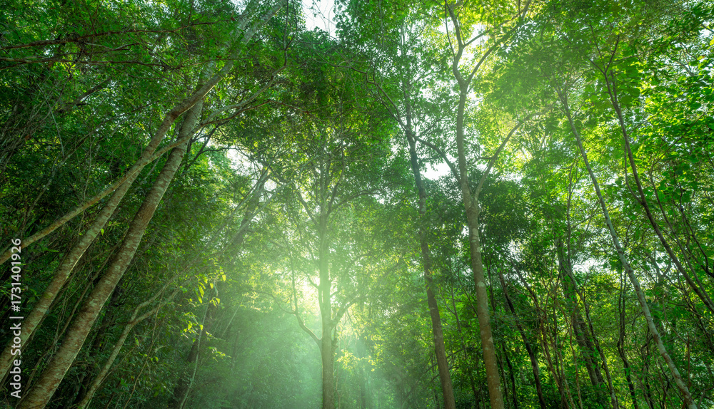 Green tropical tree forest canopy with sunlight. Sustainability carbon capture carbon credit and climate change solutions for environmental preservation and eco balance. Sustainable green environment.