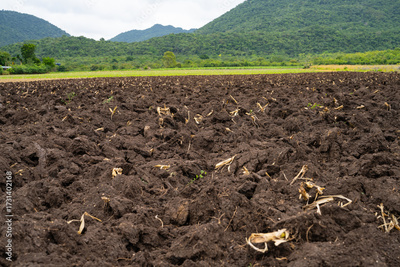 Plowed agricultural field after sugarcane harvest with rich brown soil prepared for new planting. Food security, soil health, and sustainable farming landscape in rural countryside. World soil day.