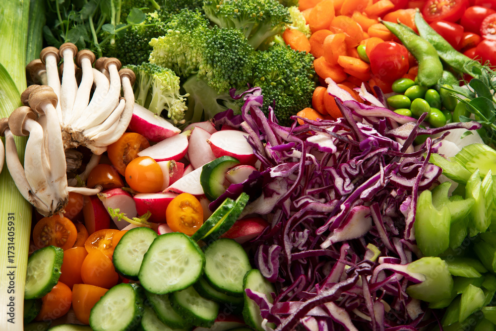 Healthy vegetarian food background. Sliced fresh vegetables.