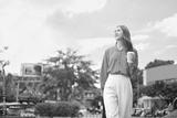 Businesswoman in stylish outfit walking through urban park with takeaway coffee