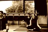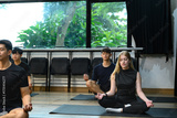 Group of people practicing mindfulness and breathing in a calm yoga studio